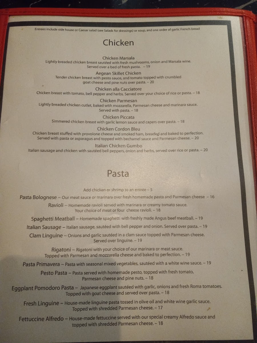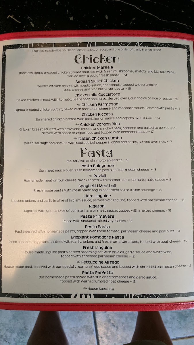 The chicken dishes form a strong core of the menu, highlighting comforting Italian-American classics such as Chicken Marsala, Chicken Alla Cacciatore, Chicken Parmesan, and Chicken Piccata, as well as more distinctive options like Aegean Skillet Chicken. Each dish feels designed to satisfy both familiar cravings and a desire for depth of flavor. Pasta lovers are equally well served, with staples including Pasta Bolognese, Ravioli, Spaghetti Meatball Italian Sausage, and Clam Linguine, all pointing to a focus on hearty sauces and well-known combinations.