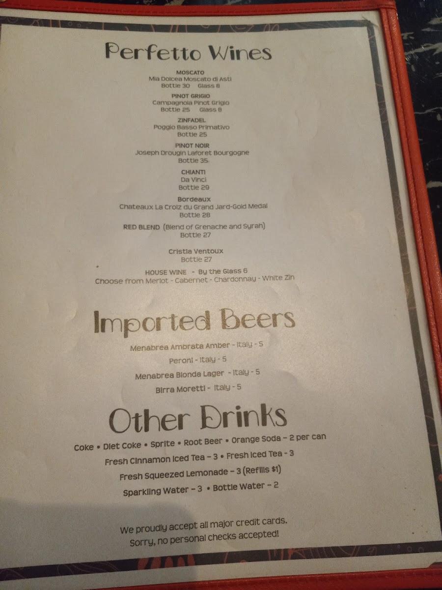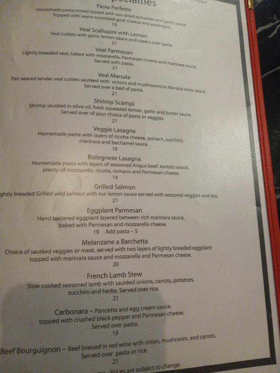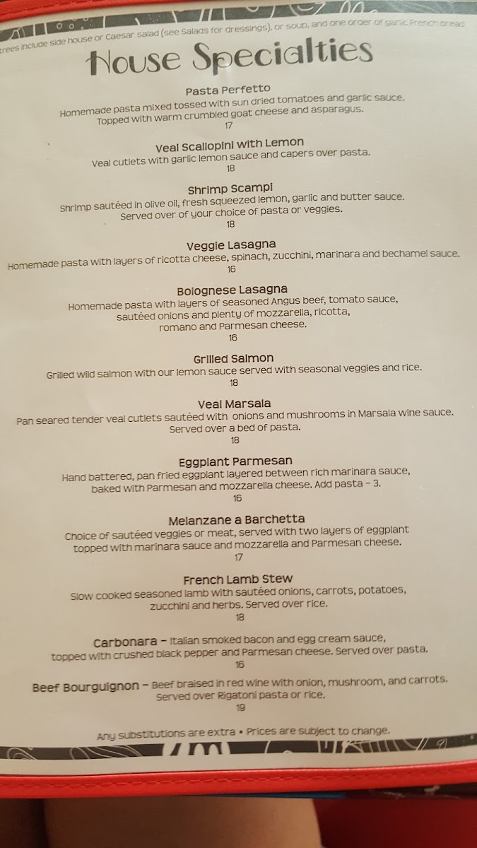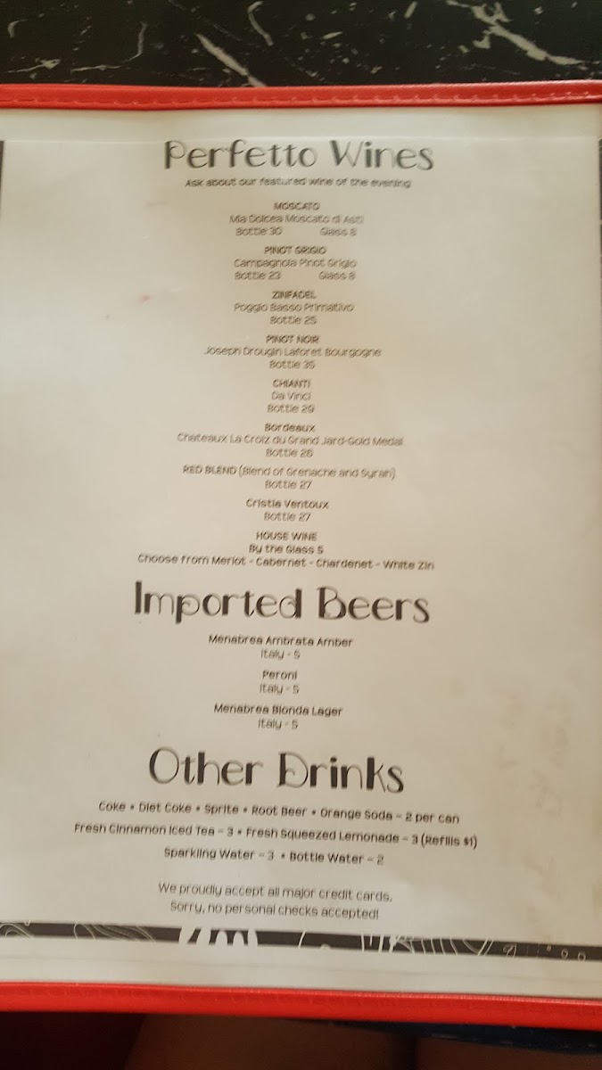The menu extends further with specialties such as Pasta Perfetto, Veal Scallopini With Lemon, Veal Parmesan, Veal Marsala, and Shrimp Scampi, which elevate the offering with richer proteins and more refined preparations. House favorites like Veggie Lasagna and Bolognese Lasagna round out the experience, reinforcing the restaurant’s commitment to classic comfort. Overall, the menu feels cohesive and satisfying, leaving the impression of a kitchen that values tradition, generosity, and crowd-pleasing Italian cuisine.